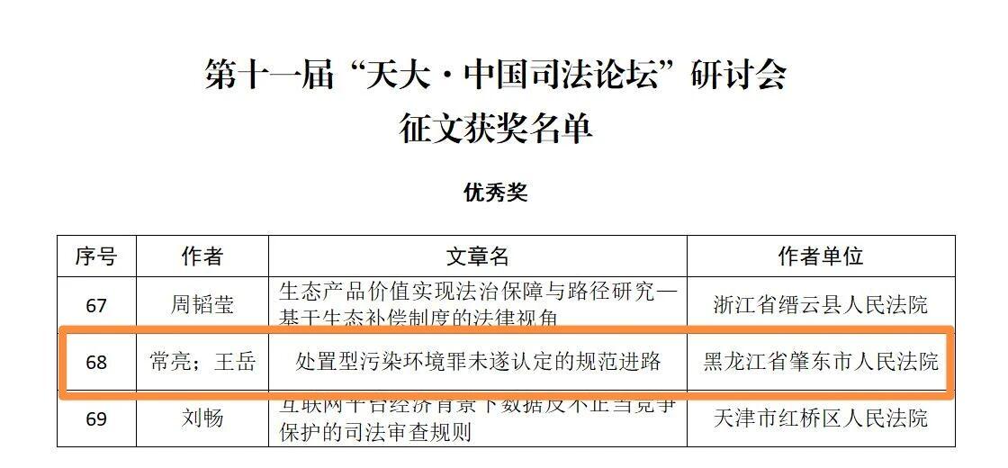黑龍江經(jīng)濟(jì)網(wǎng)訊(董慧瑩 李雪松)近日,由中國行為法學(xué)會司法專業(yè)委員會主辦、天津大學(xué)承辦的第十一屆“天大·中國司法論壇”研討會征文獲獎(jiǎng)名單公布。本次征文活動(dòng)共收到投稿論文620篇,經(jīng)評委會嚴(yán)格評審,共選出一等獎(jiǎng)8個(gè)、二等獎(jiǎng)24個(gè)、三等獎(jiǎng)48個(gè)、優(yōu)秀獎(jiǎng)102個(gè)。其中,肇東市人民法院審管辦副主任常亮、審管辦書記員王岳撰寫的學(xué)術(shù)論文《處置型污染環(huán)境罪未遂認(rèn)定的規(guī)范進(jìn)路》榮獲優(yōu)秀獎(jiǎng)。