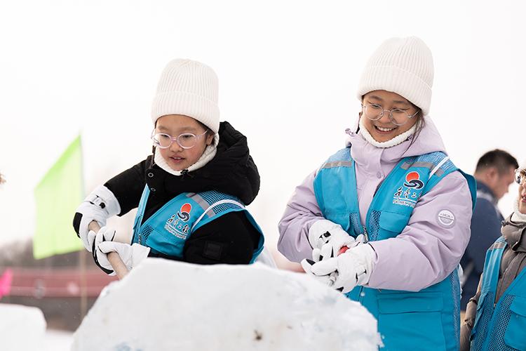 孩子們拿起雪鏟自己動手進行冰雕