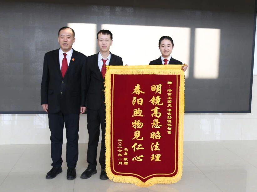 黑龍江經濟網訊(董慧瑩 張智雪)1月15日,青岡縣人民法院王國慶法官收到當事人贈予的錦旗,“明鏡高懸昭法理 春陽煦物見仁心”十六個金字熠熠生輝,既是當事人對案件審理的由衷認可,更是對法院司法工作的高度贊譽,為冬日里的法院增添暖意。