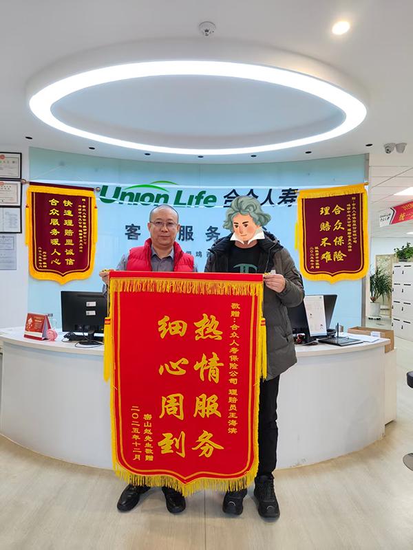 2026年1月5日,Z先生的兒子特意來到中支柜面,親手送來一面感謝的錦旗,書寫“熱情服務(wù) 細(xì)心周到”以此表達(dá)他們深深的謝意。錦旗上熠熠生輝的字句,不僅是對(duì)理賠人員專業(yè)服務(wù)的高度認(rèn)可,更是對(duì)合眾人壽溫暖關(guān)懷的由衷贊譽(yù),彰顯了合眾人壽在客戶心中樹立的良好形象以及雙方之間深厚的信任與情誼。