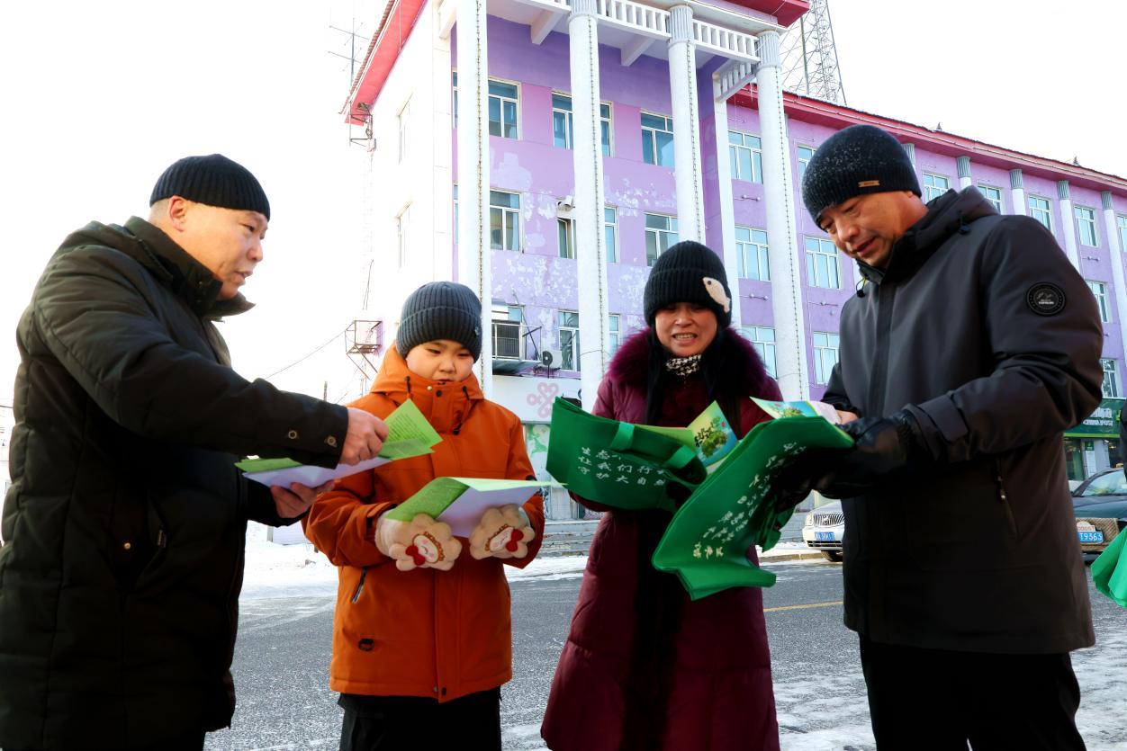 阿木爾林業(yè)局聯(lián)合宣傳小組在人員密集場所,拉起條幅營造濃厚的濕地保護氛圍(王力 攝)
