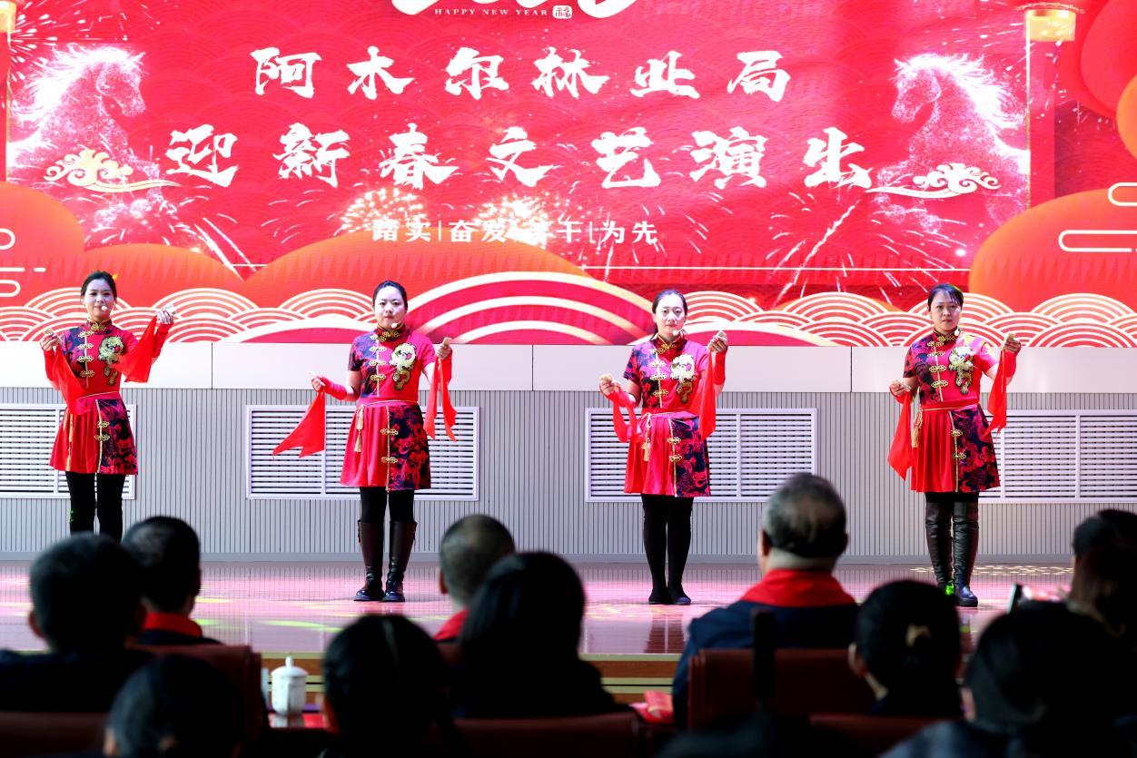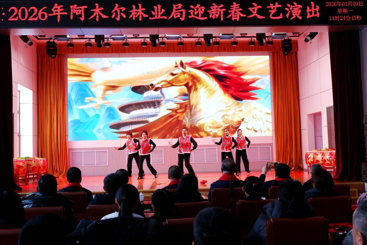 演出伊始,林業(yè)局黨委負(fù)責(zé)人王飛發(fā)表熱情洋溢的致辭,向全體職工及家屬致以新春祝福與誠(chéng)摯問(wèn)候。伴隨著躍馬揚(yáng)鞭、震撼人心的鼓舞《賽馬》,整場(chǎng)演出正式拉開帷幕。 歌曲獨(dú)唱、聯(lián)唱飽含深情,《我從草原來(lái)》《越往北越美》《逐夢(mèng)前行》等曲目,唱出林區(qū)人質(zhì)樸赤誠(chéng)的家國(guó)情懷,抒發(fā)熱愛(ài)故土、勇毅擔(dān)當(dāng)?shù)恼鎿辞楦小?/p>