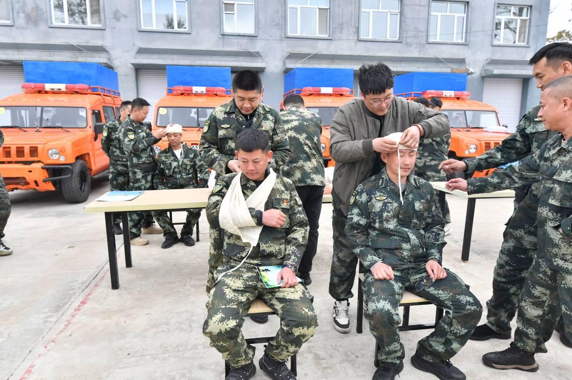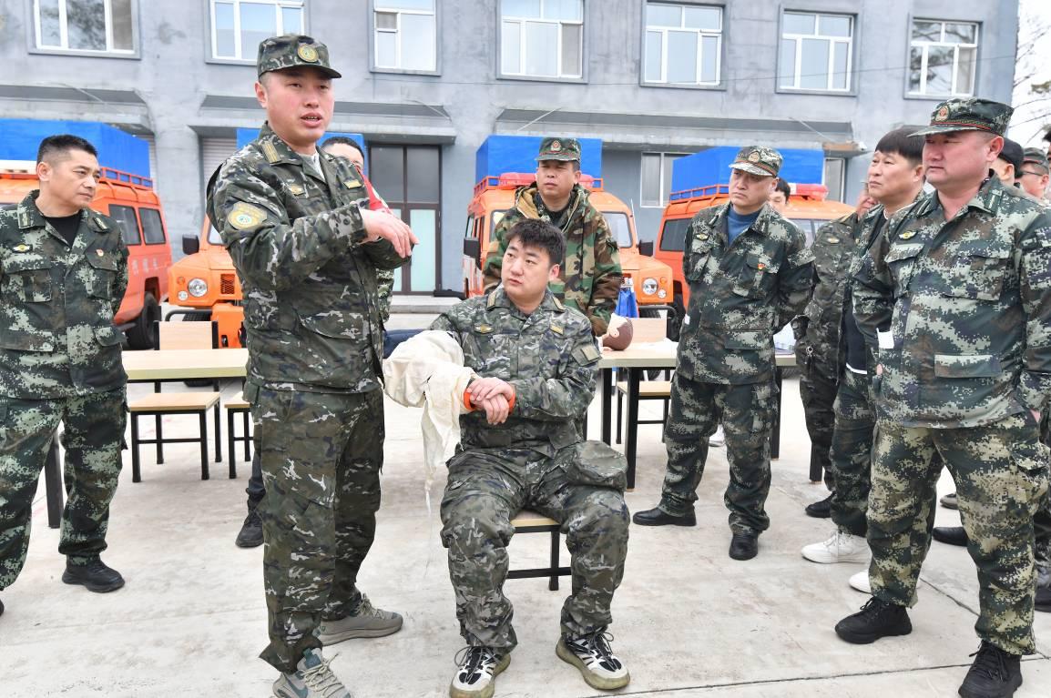 創(chuàng)傷包扎實(shí)操區(qū)同樣熱火朝天,參訓(xùn)人員3人一組,互相充當(dāng)“模擬傷員”,在醫(yī)護(hù)人員的一對(duì)一指導(dǎo)下,反復(fù)練習(xí)頭部、手部、腿部等不同部位的包扎方法?!爸霸诨饒?chǎng)遇到戰(zhàn)友受傷,只能憑著經(jīng)驗(yàn)簡(jiǎn)單處理,今天學(xué)的八字包扎法既牢固又省時(shí)間,下次再遇到類似情況就知道怎么規(guī)范操作了!”來自倭勒根林場(chǎng)的參訓(xùn)隊(duì)員一邊給隊(duì)友包扎手臂,一邊笑著和身邊的人分享學(xué)習(xí)感受。一上午的實(shí)操訓(xùn)練下來,不少隊(duì)員的手上都沾了不少醫(yī)用膠帶的膠漬,但每個(gè)人的臉上都寫滿了收獲的喜悅。