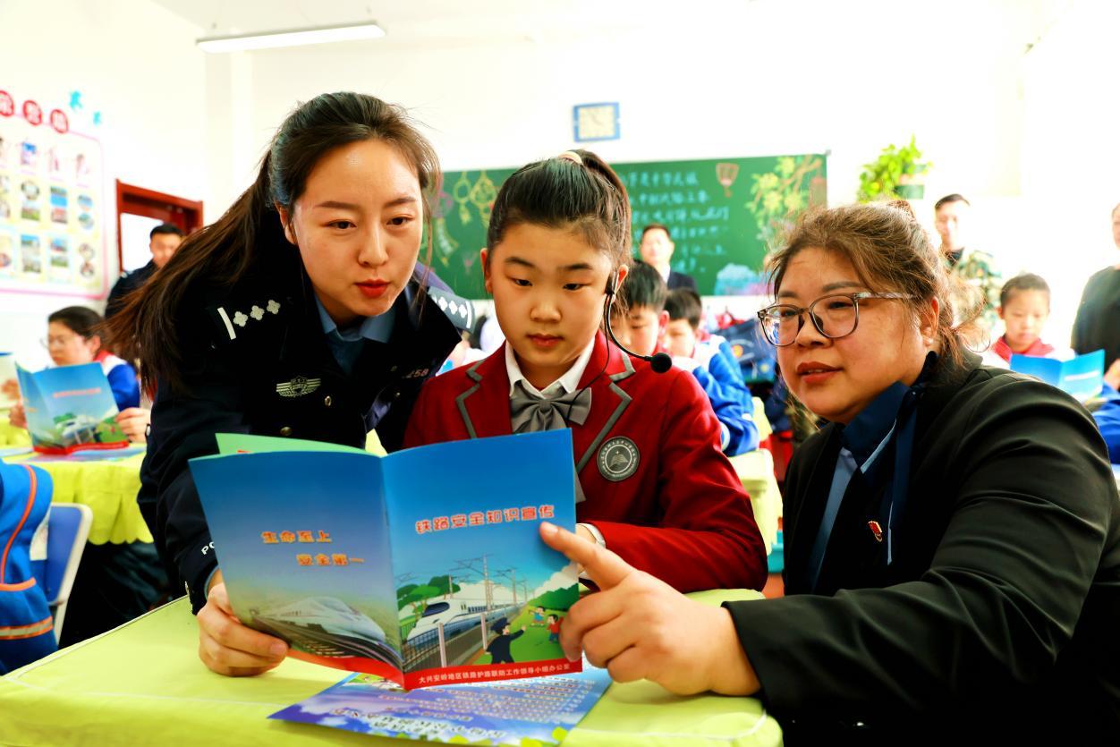 漠河站鐵路派出所的干警在向小學(xué)五年級(jí)學(xué)生講解鐵路安全注意事項(xiàng)(王力 攝)