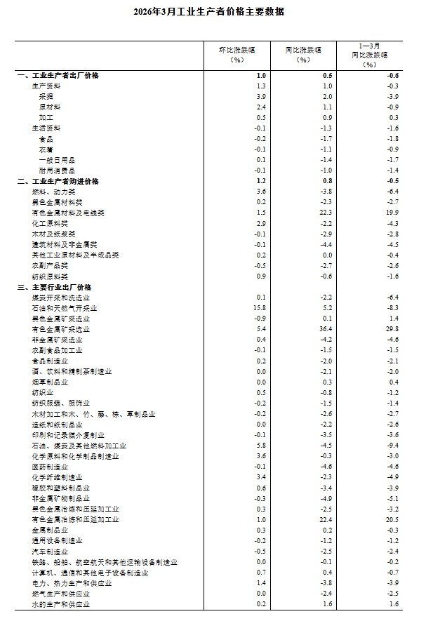2026年3月份,全國工業(yè)生產者出廠價格同比由上月下降0.9%轉為上漲0.5%;環(huán)比上漲1.0%,漲幅比上月擴大0.6個百分點。工業(yè)生產者購進價格同比由上月下降0.7%轉為上漲0.8%;環(huán)比上漲1.2%,漲幅比上月擴大0.5個百分點。一季度,工業(yè)生產者出廠價格比上年同期下降0.6%,工業(yè)生產者購進價格下降0.5%。
